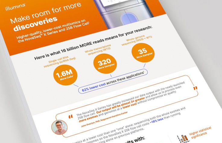 Step up your multiomics research with the NovaSeq X Series combined with the 25B Flow Cell. Achieve high-quality data with low-cost workflows to accelerate and broaden your research.